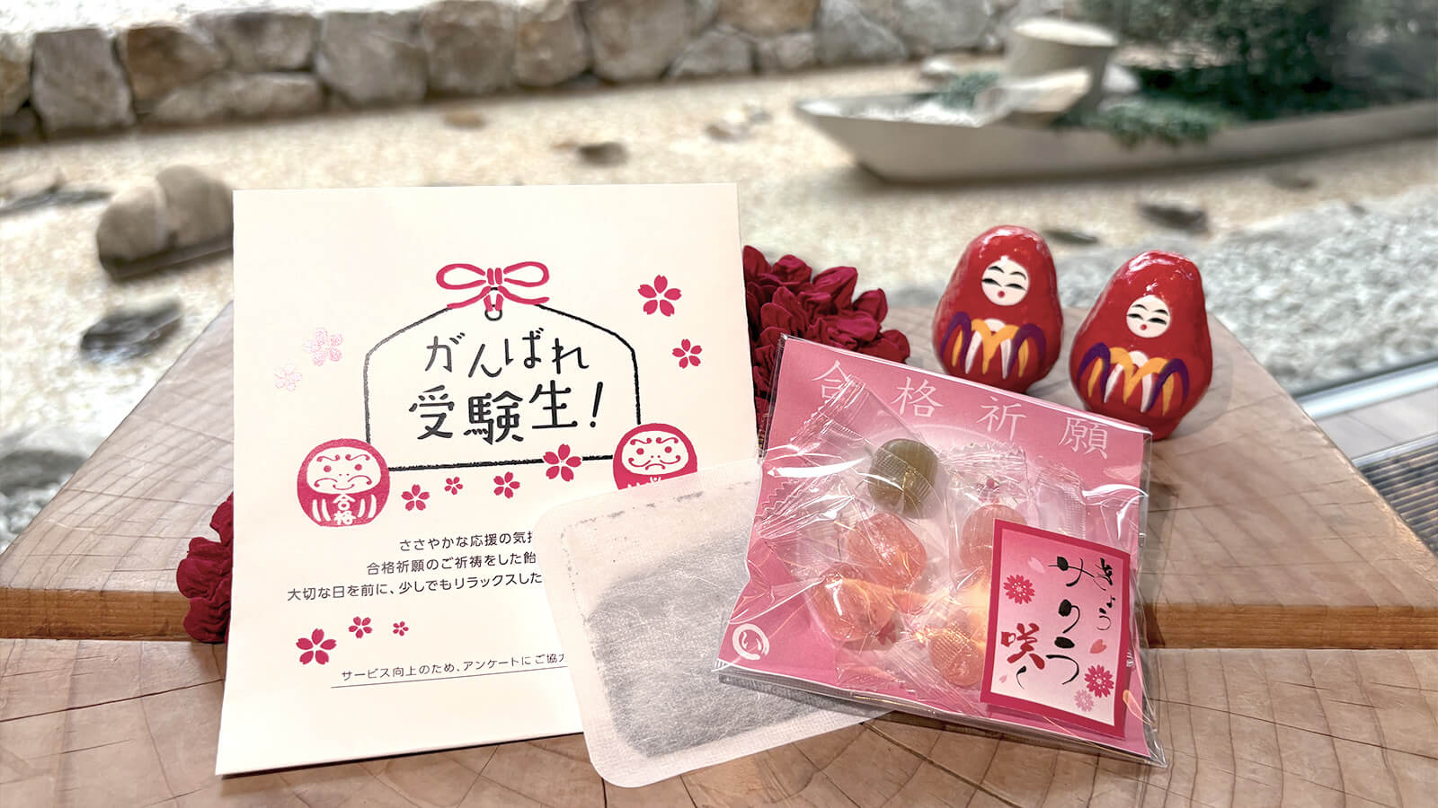 京都の厳しい寒さをしのぐミニカイロと、延喜宮 荒見神社(京都府城陽市)にてご祈祷を施した飴をご用意しました。飴には桜の花びらと桜の葉パウダーを使用し、「さくらが咲く」ように「受験に合格する」という願いが込められています。ホテルからのメッセージを添えて、最後のひとがんばりを支えます。